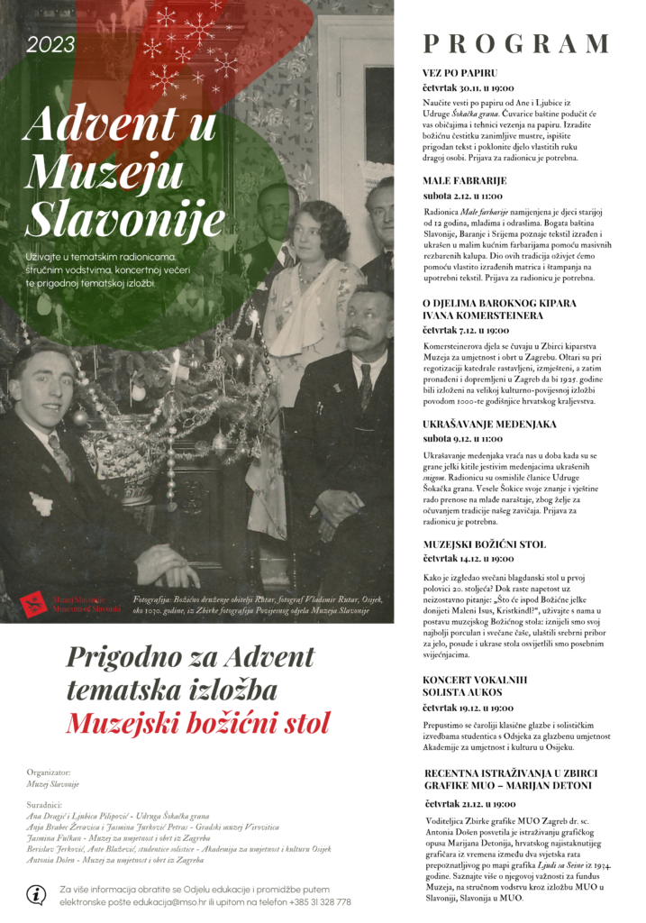 Kako je izgledao svečani blagdanski stol u prvoj polovici 20. stoljeća? Dok raste napetost uz neizostavno pitanje: „Što će ispod Božićne jelke donijeti Maleni Isus, Kristkindl?“, uživajte s nama u postavu muzejskog Božićnog stola: iznijeli smo svoj najbolji porculan i svečane čaše, ulaštili srebrni pribor za jelo, posude i ukrase stola osvijetlili smo posebnim svijećnjacima. Voditeljice: Andreja Šimičić, Gabrijela Odobašić, Muzej Slavonije