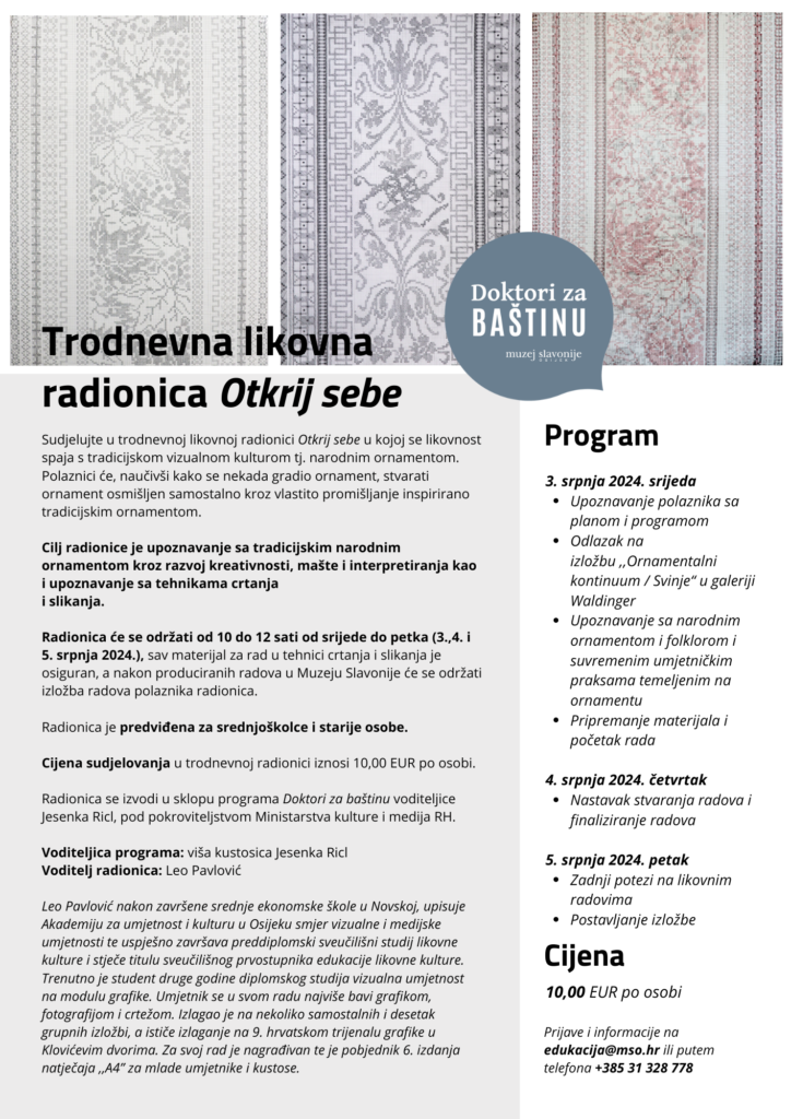 Sudjelujte u trodnevnoj likovnoj radionici Otkrij sebe u kojoj se likovnost spaja s tradicijskom vizualnom kulturom tj. narodnim ornamentom. Polaznici će, naučivši kako se nekada gradio ornament, stvarati ornament osmišljen samostalno kroz vlastito promišljanje inspirirano tradicijskim ornamentom.